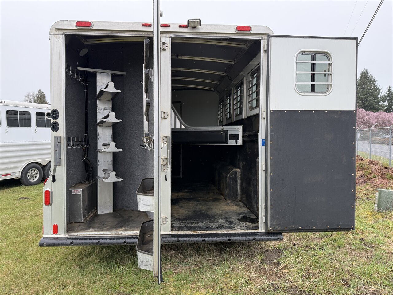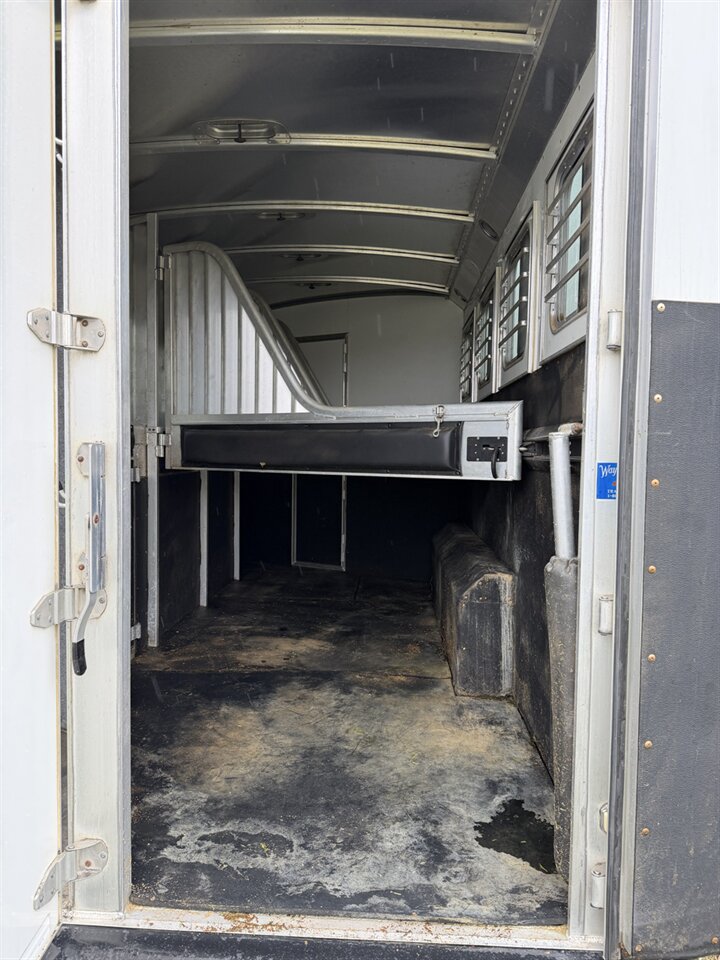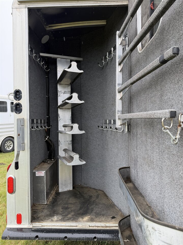 In the horse area, the trailer is equipped with room for four horses, featuring padded dividers, rubber mats, and excellent ventilation to ensure your horses travel safely and comfortably. The rear tack area provides additional storage for saddles, bridles, and gear.