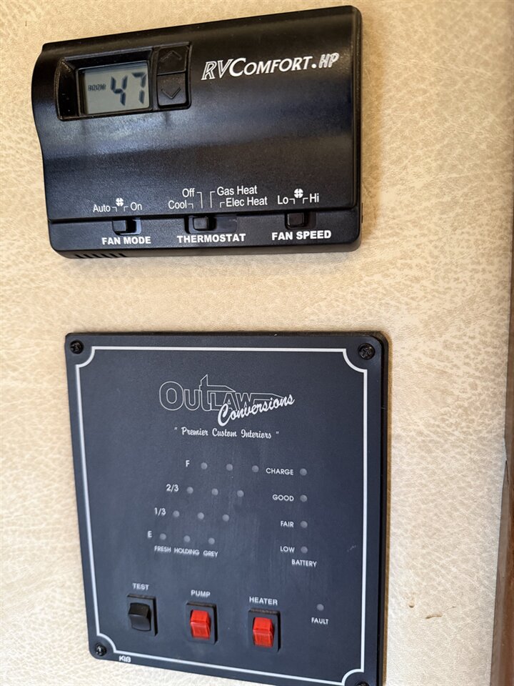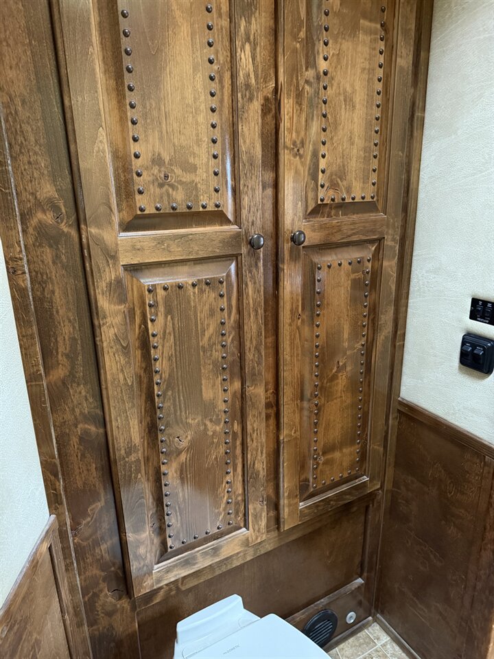 The spacious 13’ Outlaw conversion living quarters features a comfortable and functional layout with a sofa, kitchenette, refrigerator, microwave, cooktop, sink, and ample cabinetry for storage. The bathroom includes a shower, toilet, and vanity, making overnight trips convenient and comfortable. Climate control keeps the space comfortable year-round.