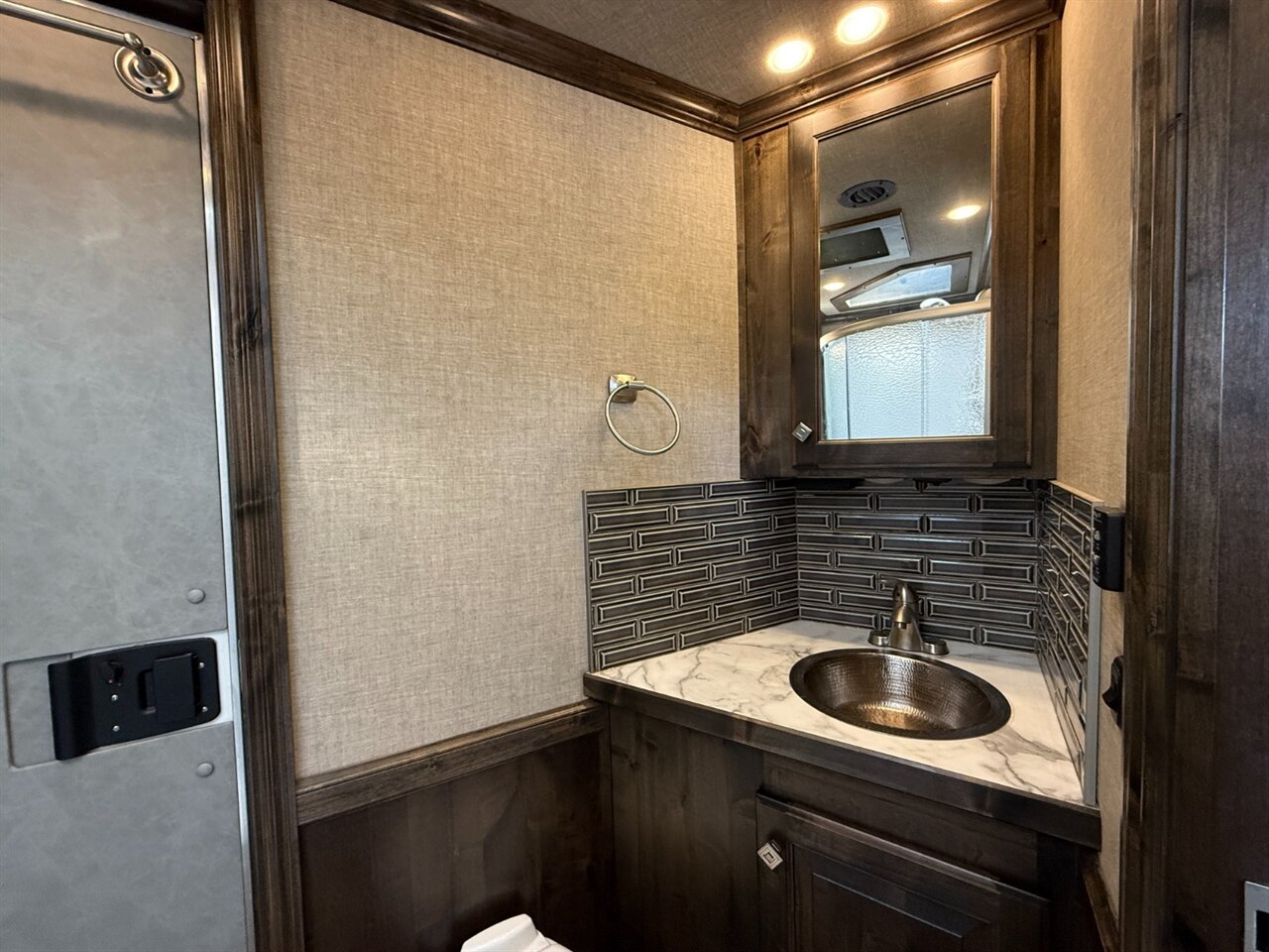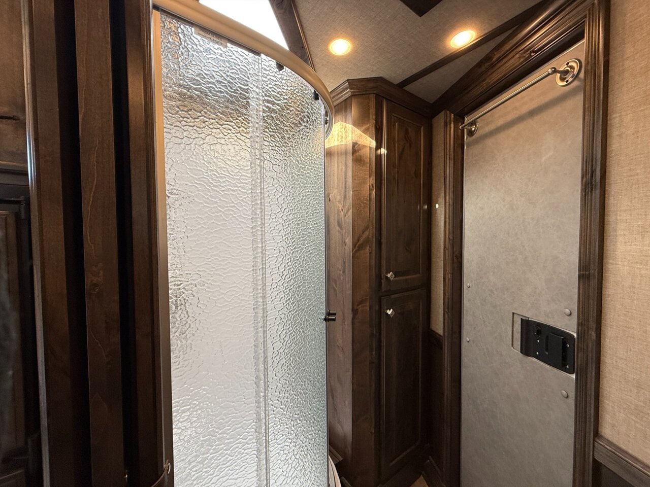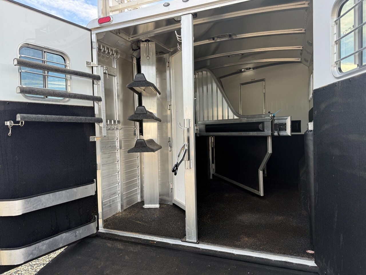 The horse area is designed with the well-being of your horses in mind. It includes three spacious stalls, each with padded dividers to ensure comfort during transport. The rubberized flooring provides excellent traction and minimizes the risk of slipping. There are also adjustable feed mangers and tie rings for secure and convenient access to hay and water. The horse area features ample headroom and a well-ventilated design to keep your horses comfortable during travel.