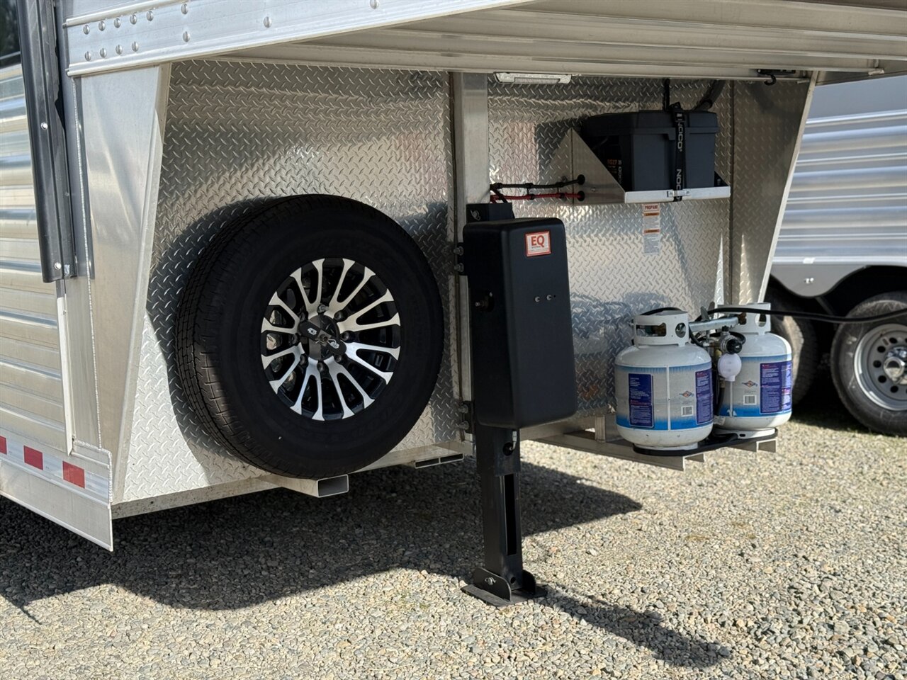 The exterior of the 2025 4-STAR 3-HORSE LQ Outback Customs is built with a durable aluminum construction, providing a lightweight yet sturdy frame. It features a sleek, aerodynamic profile that enhances towing efficiency. The trailer is equipped with a spacious tack room that includes a well-organized saddle rack and ample storage for gear. The drop-down windows with safety bars ensure excellent ventilation for your horses while traveling. Additionally, the trailer includes LED exterior lighting for enhanced visibility and safety during nighttime loading and unloading.