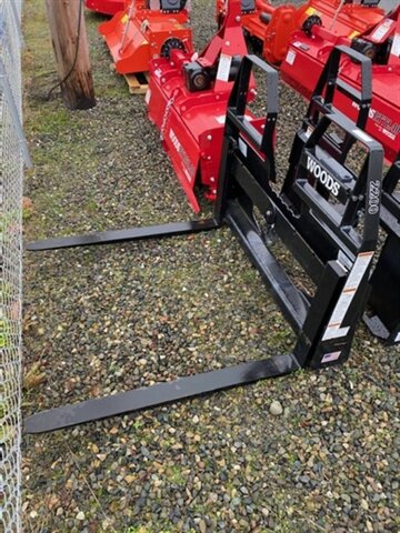 Woods® Pallet Forks PFW2242S Features may include: Walk-thru frame and low step offer easy access and optimum visibiity High back guard with movable walk-thru cross bar – relocate to fit your prime mover and application Standard forged clevis for lifting from a single point on the frame Certiftied, forged steel fork tines (ISO Class 2A) for strength and long life Robotically welded for consistent high quality
