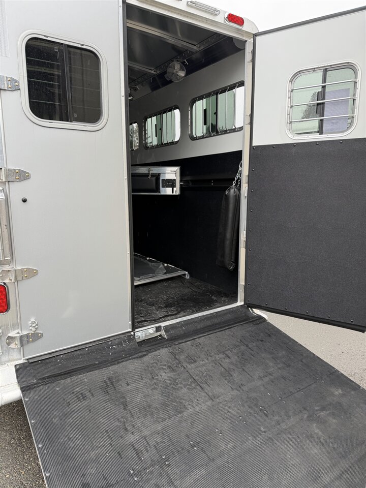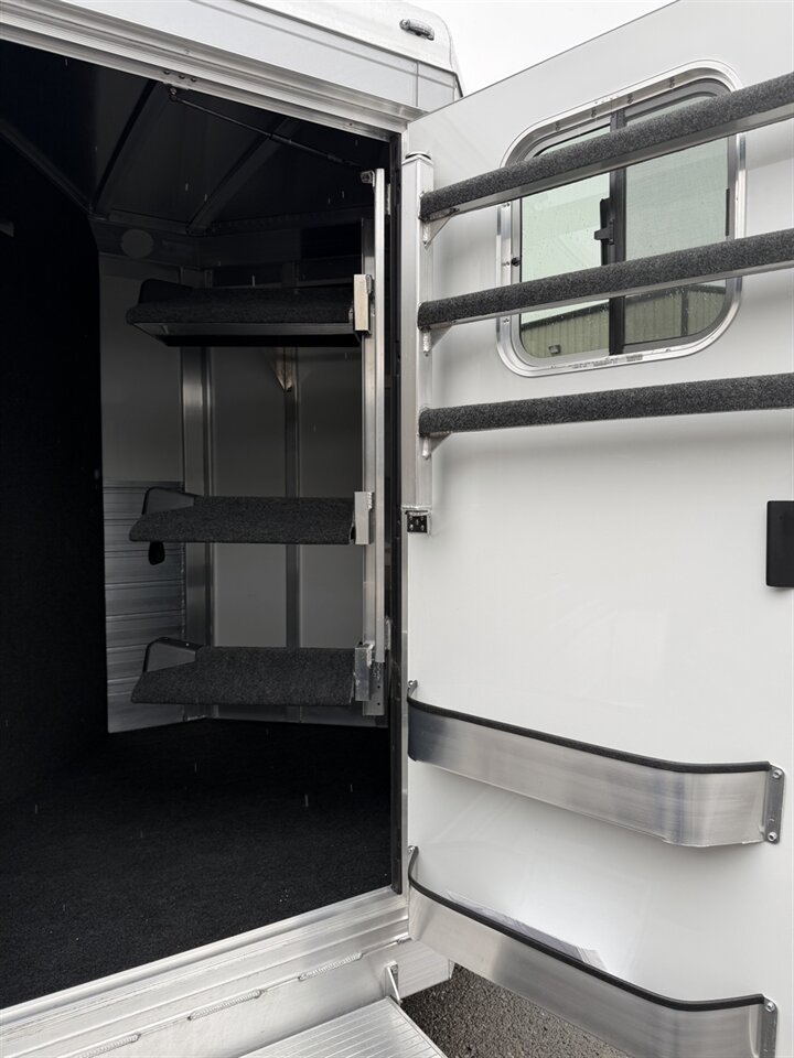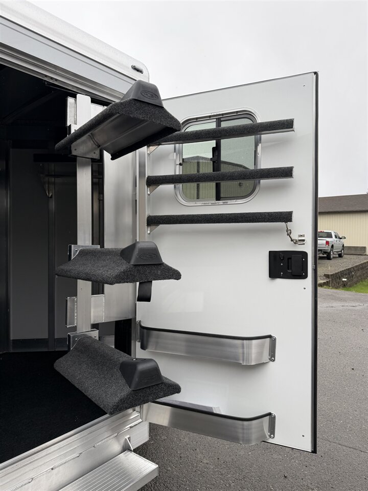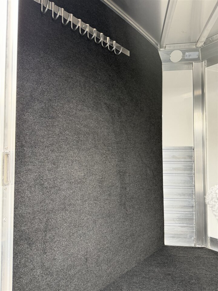 The extra foot in the tack room provides valuable additional storage space, giving you more room for saddles, gear, and show-day essentials. Inside, you'll find adjustable saddle racks to customize your setup, along with a carpeted bulkhead wall that helps reduce noise and adds a finished touch.