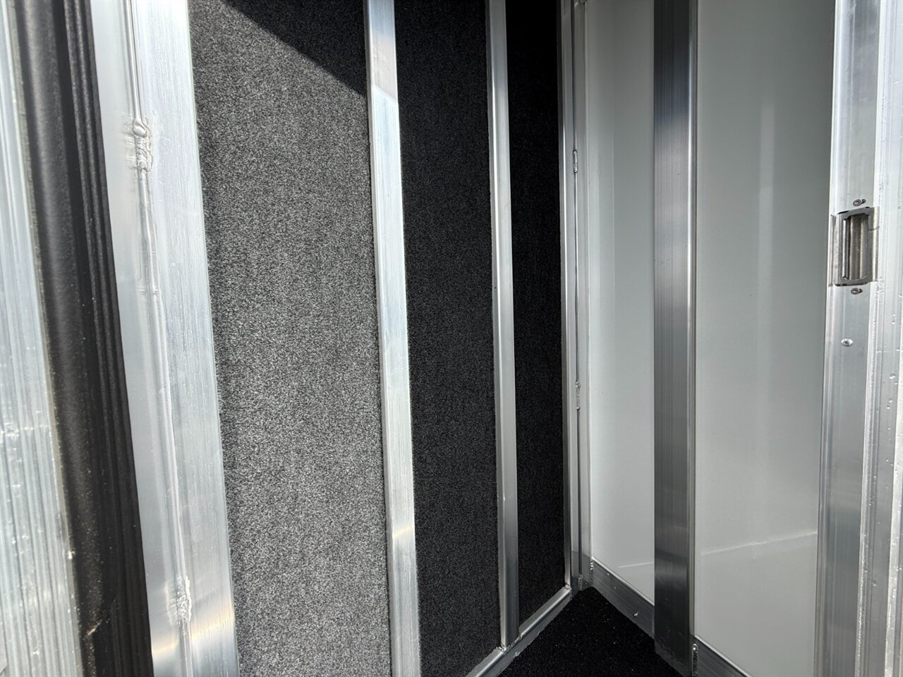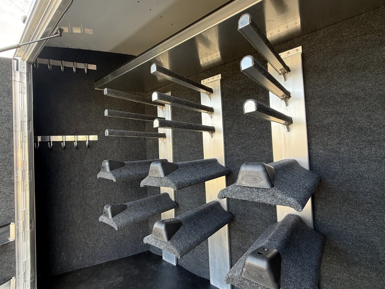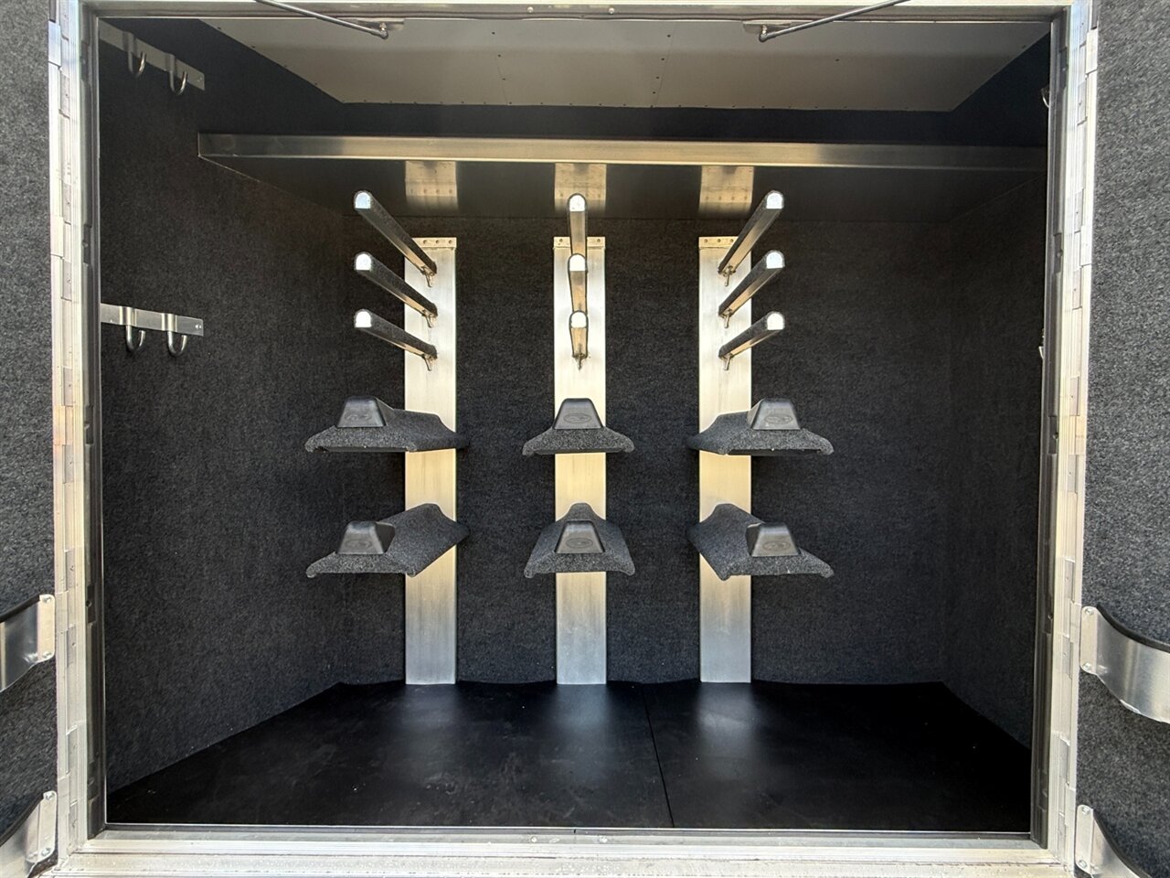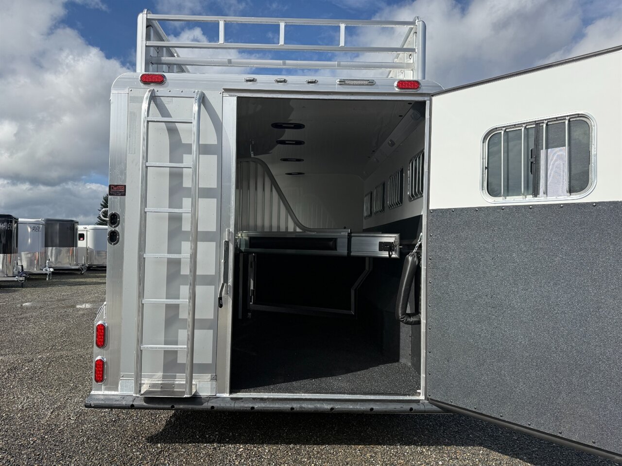 Convenience features include a hydraulic jack for effortless hitching and unhitching, along with an 8' hay rack complete with ladder, giving you extra storage without sacrificing interior space.